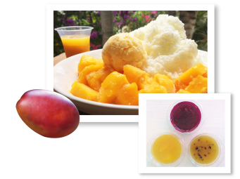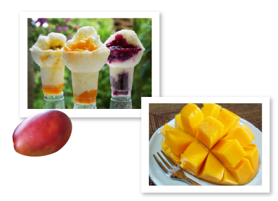 果肉入りのマンゴージェラートに、またまた果肉入りのあま~いソースをかけました!宮古島産マンゴーを丸々1個分使った贅沢なスペシャル雪氷です。